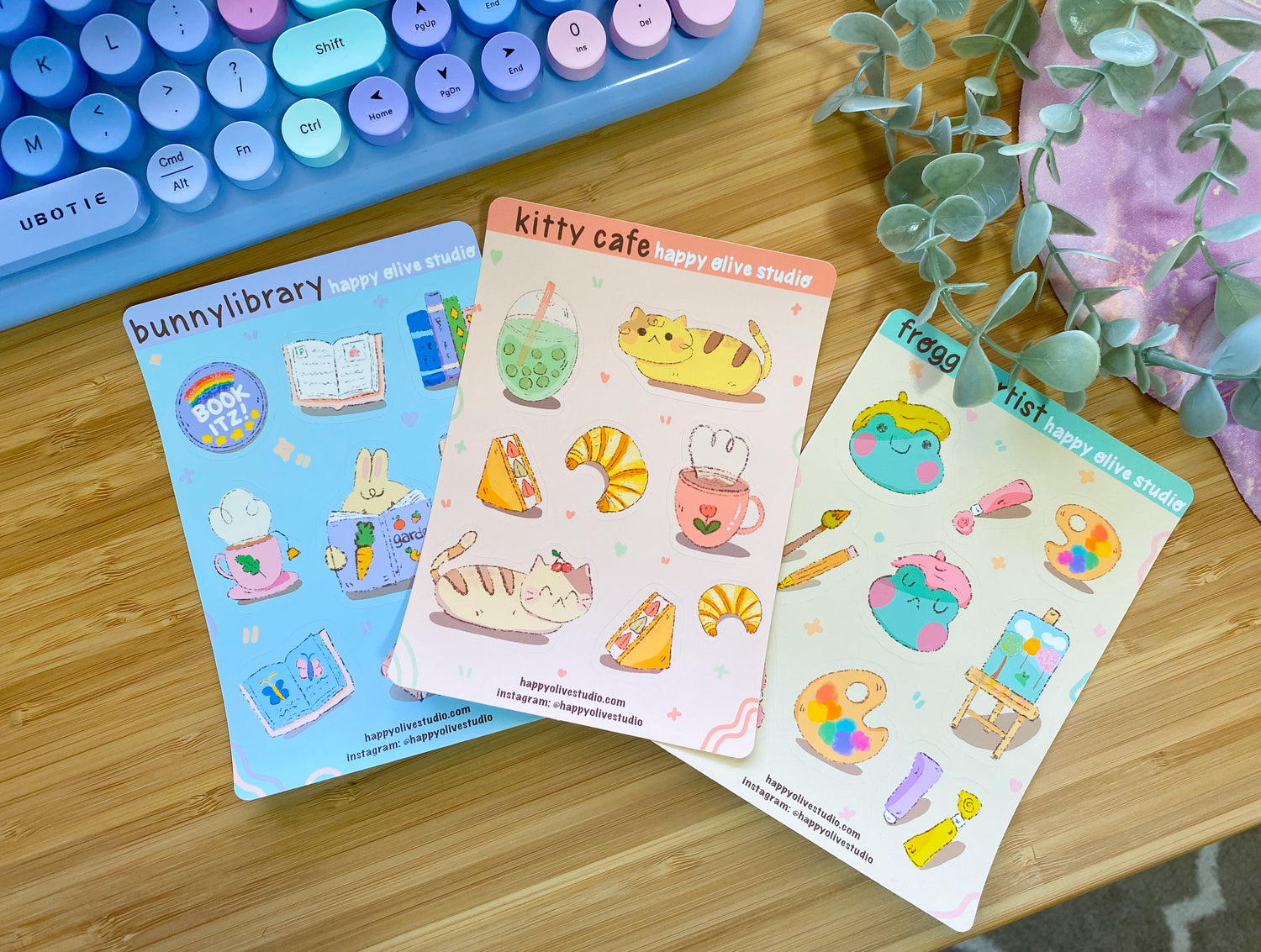 Happy Olive Studio is an art shop offering cute, cozy (and sometimes spicy) stickers, stationery, paintings, and more! Every piece is designed, drawn, or painted by the owner and artist, Amy. Welcome!