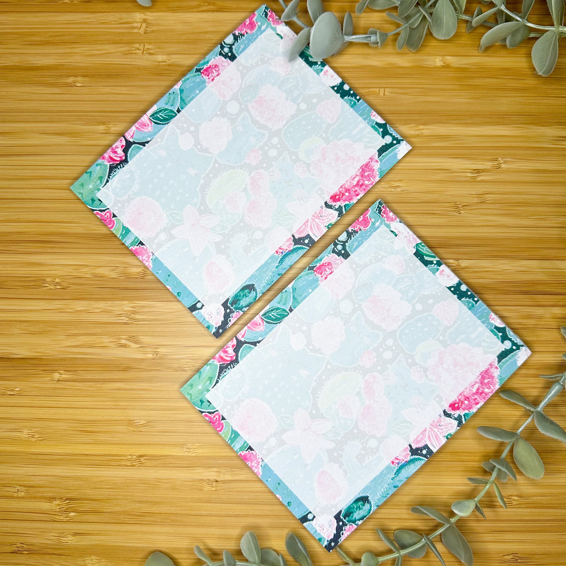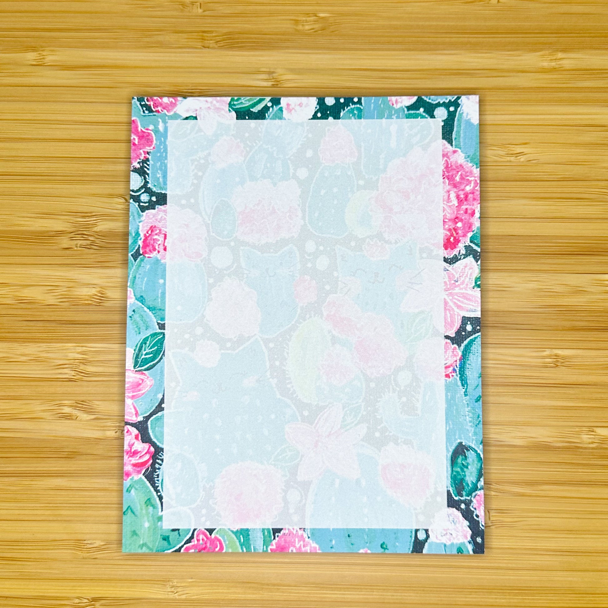 The design of this notepad is a from of an original acrylic painting on canvas by Amy, the owner and artist of Happy Olive Studio. Features kitties and cacti.