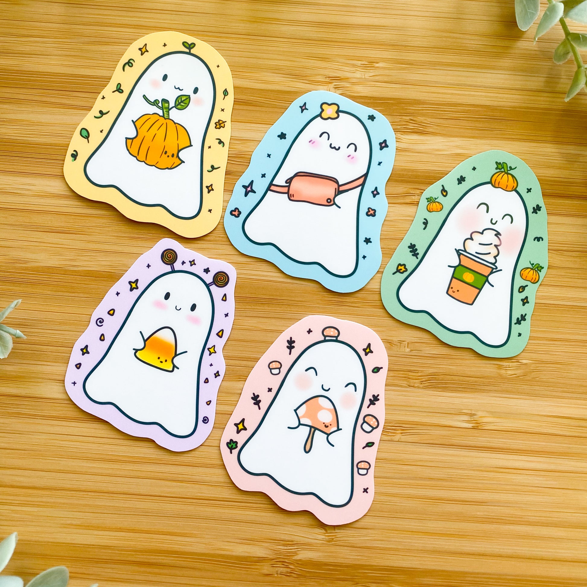 Add some cozy vibes to your belongings with these Cozy Ghosts Stickers! Featuring festive ghosts enjoying their favorite things, these matte vinyl stickers are weatherproof, so you don't have to worry about them fading away.