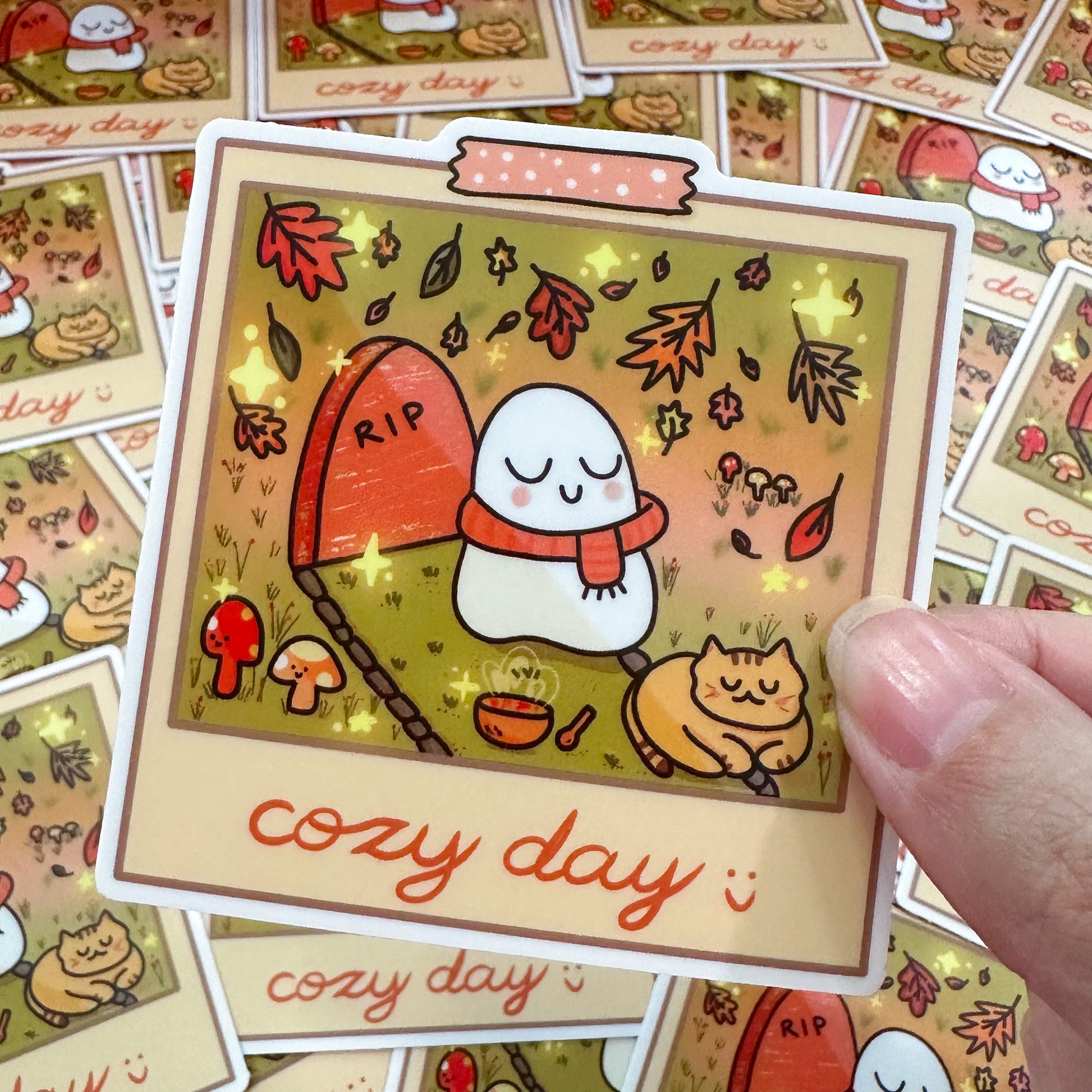 Wanna cozy up with some spooky friends? This 'Cozy Day' Pola sticker is perfect, featuring a ghost, cat, and mushroom hanging out in the cemetery on an autumn day!