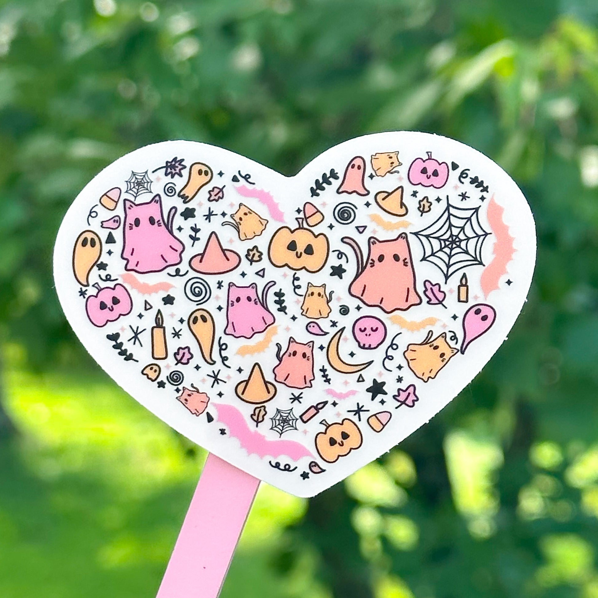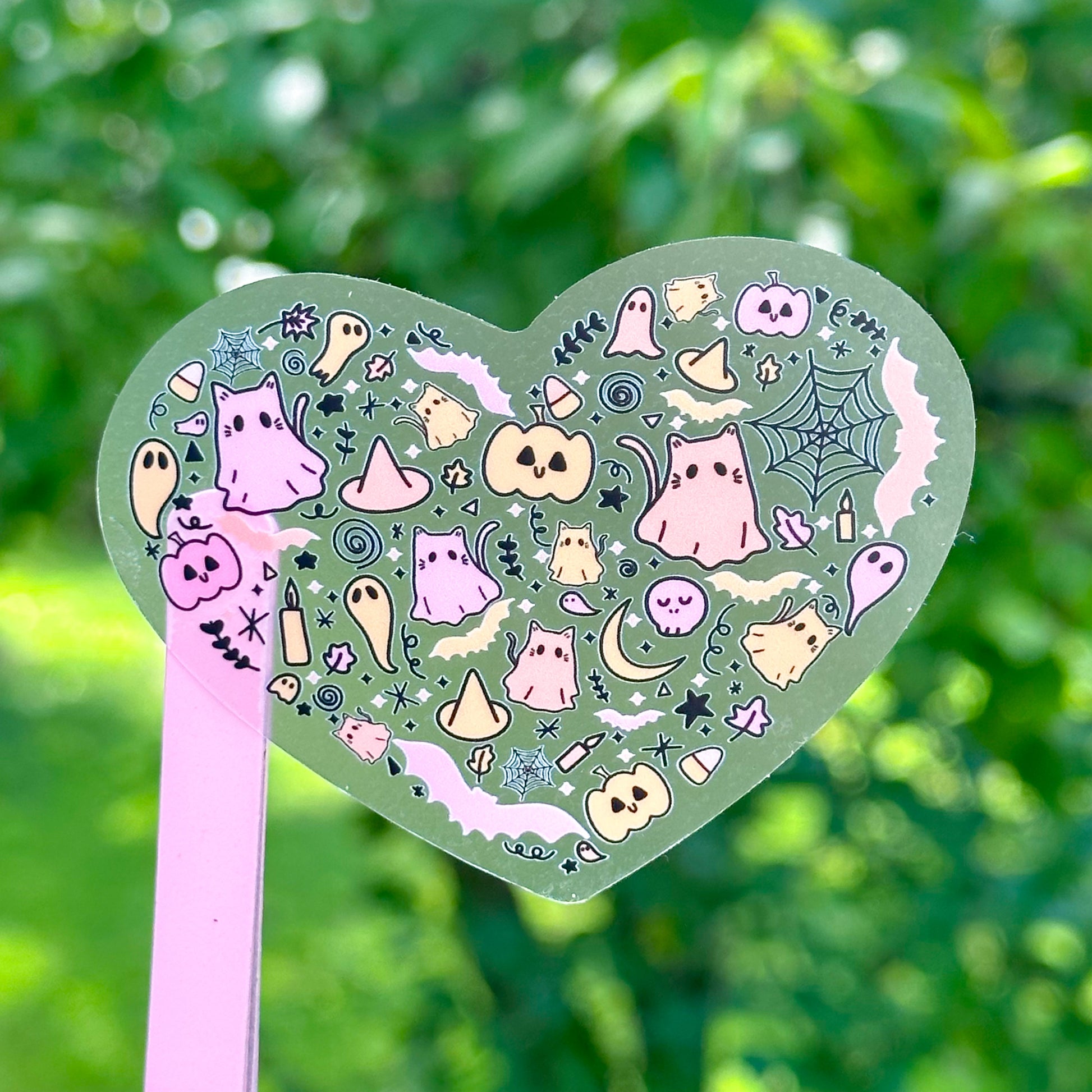 A lovely heart filled with all things Halloween. This sticker is clear (see photo) once peeled from its backing. Waterproof and dishwasher safe - perfect for water bottles, laptops, journals, and more!