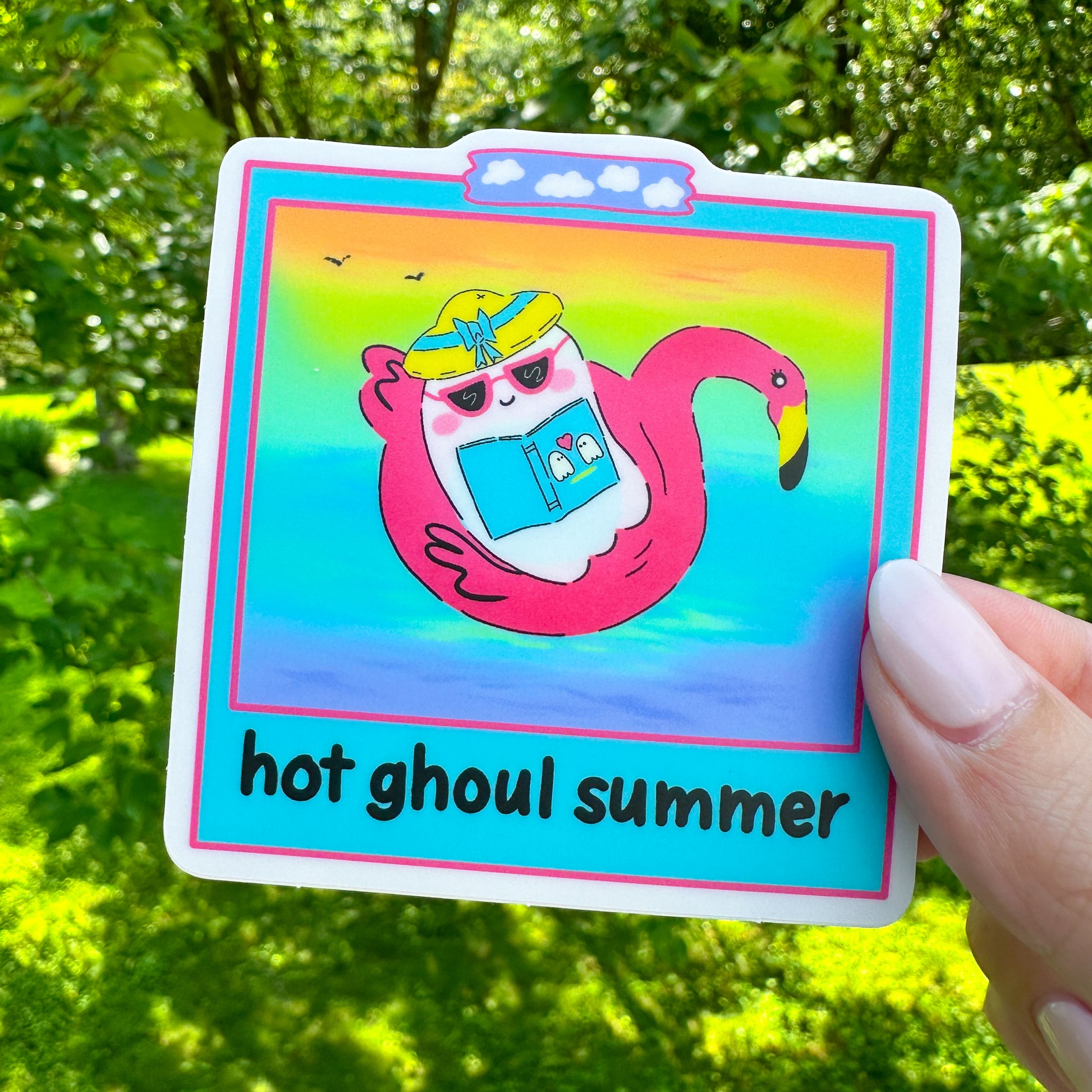 A cute little ghostie reading a ghostie romance book on a pool floatie!