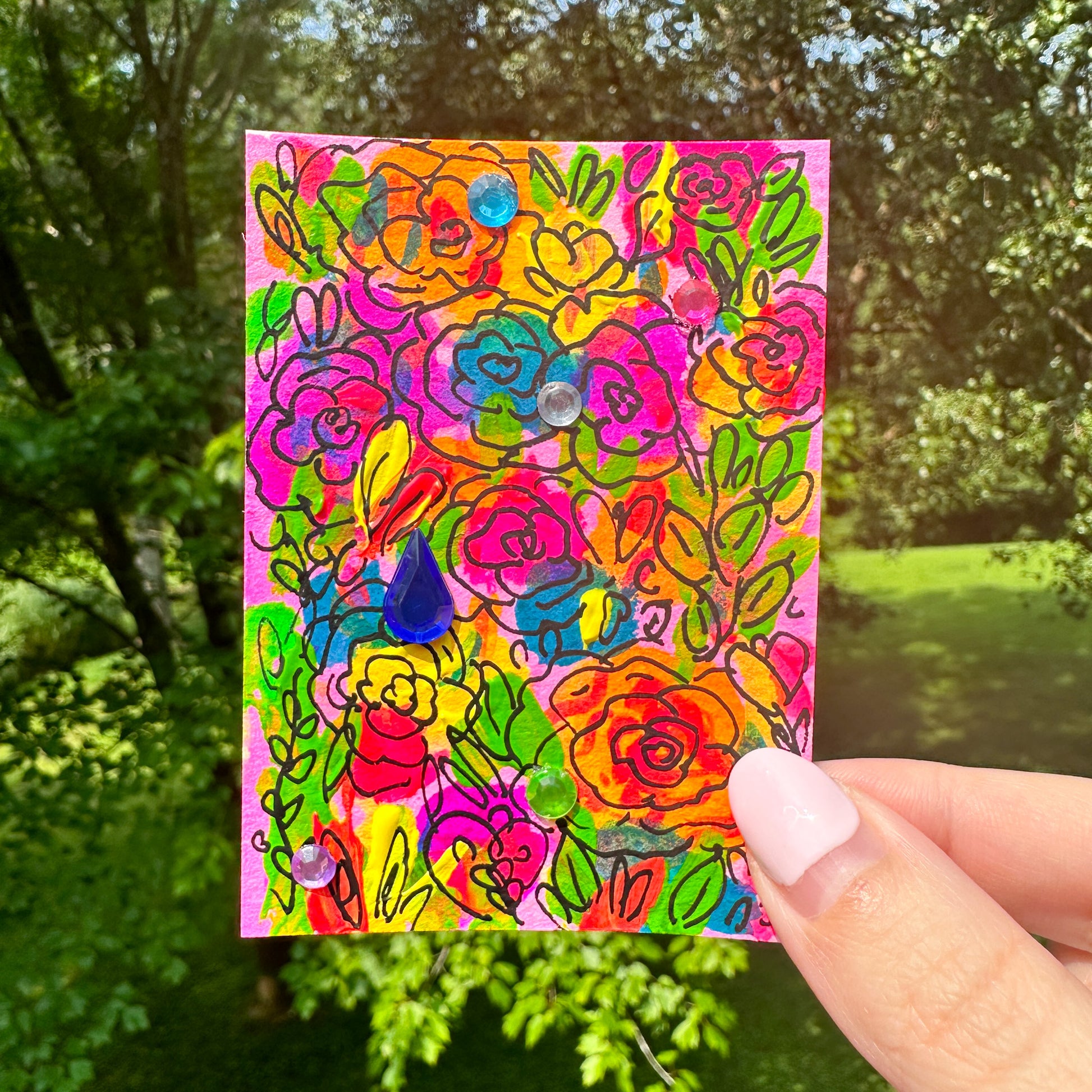 ACEO stands for Art Cards Editions and Originals (they may also be referred to as ATCs: Artist Trading Cards). They feature small, original works of art that may include different mediums. Some cards may be part of a series, limited edition, or a one-off piece. All cards measure 2.5" x 3.5". ACEOs are a perfect way to own a little piece of someone's original art!