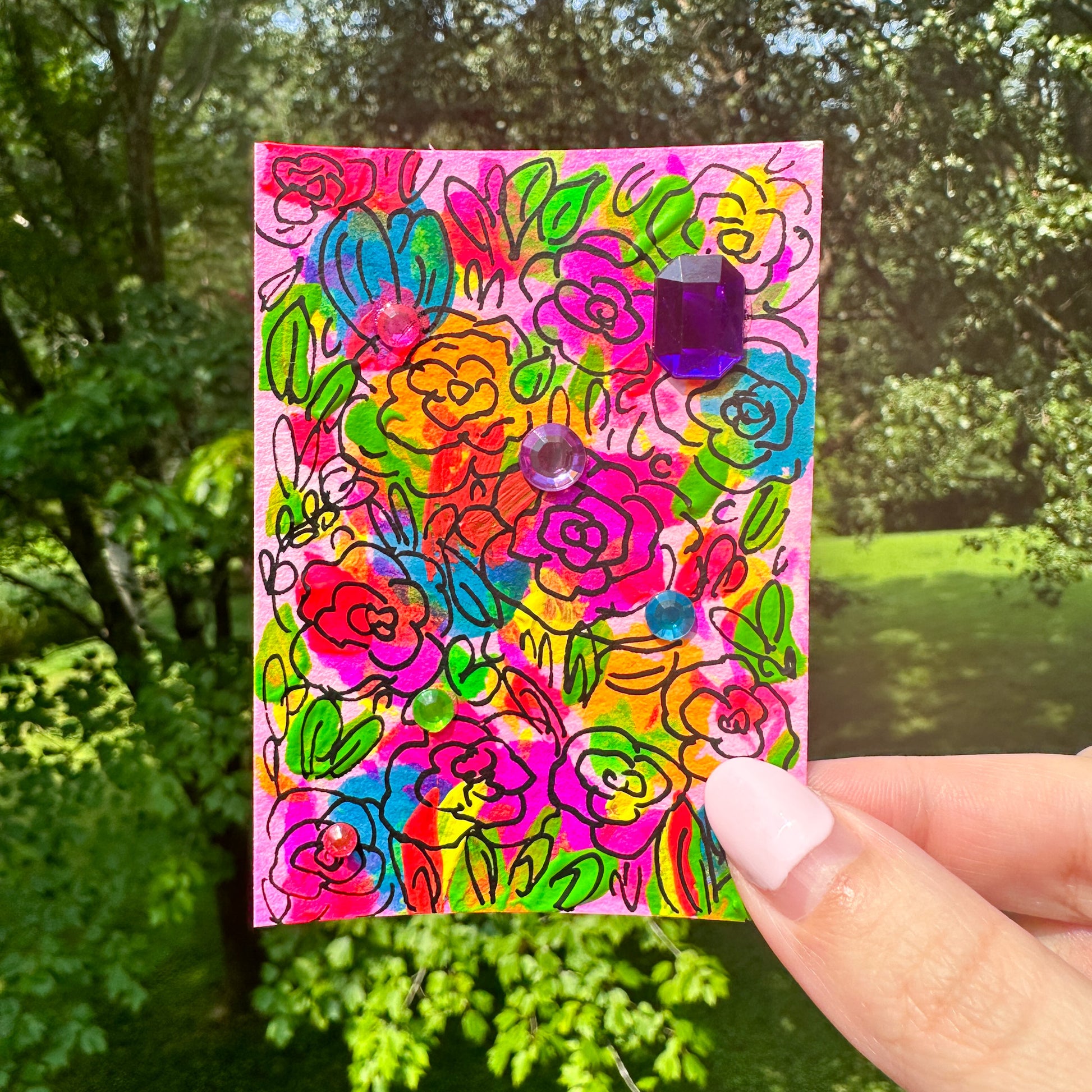 This listing is for one original ACEO art card. Each card is unique; no two are the same. I hand painted each card with watercolor, acrylic, and applied rhinestones. Each card is numbered and hand-signed on the back.