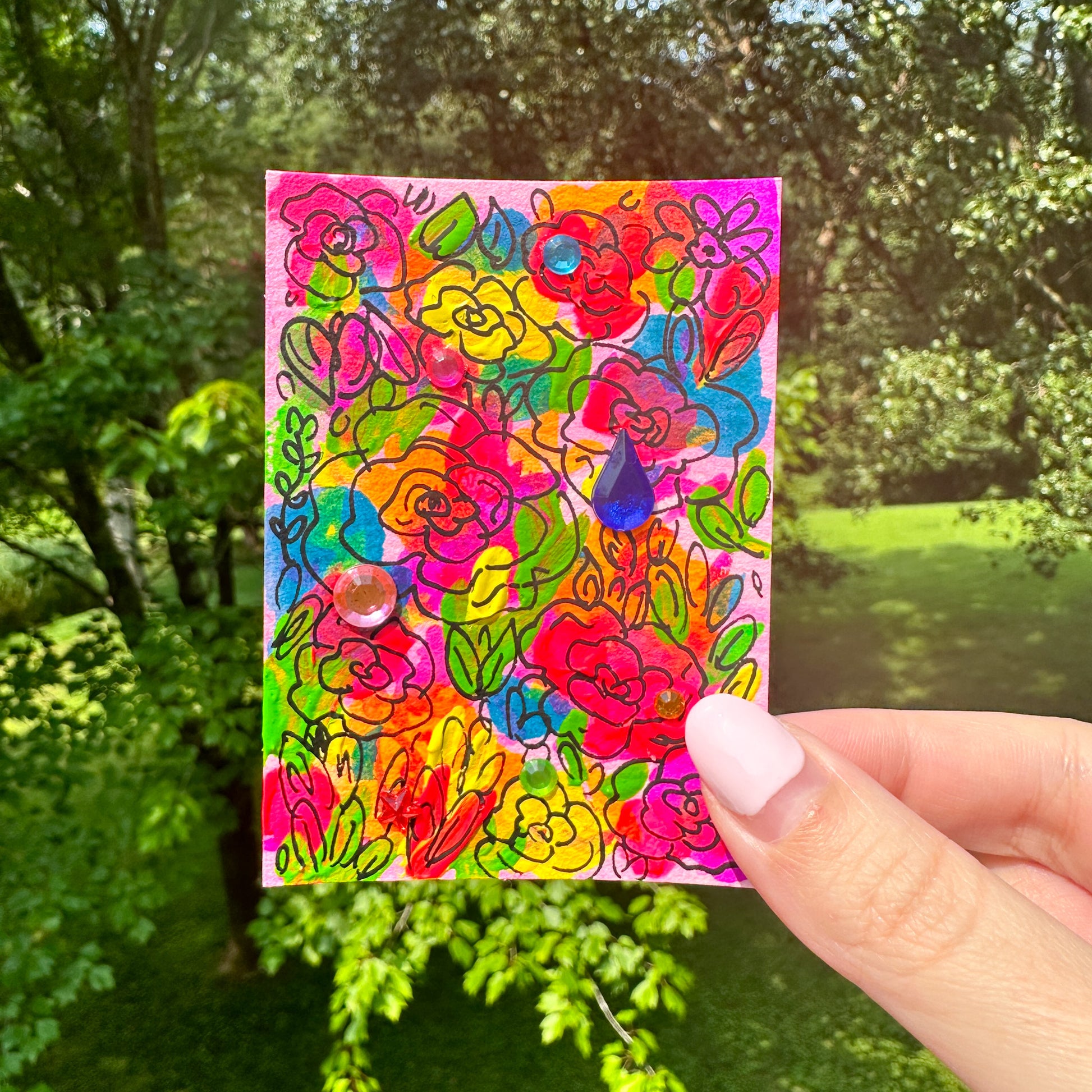 This listing is for one original ACEO art card. Each card is unique; no two are the same. I hand painted each card with watercolor, acrylic, and applied rhinestones. Each card is numbered and hand-signed on the back.