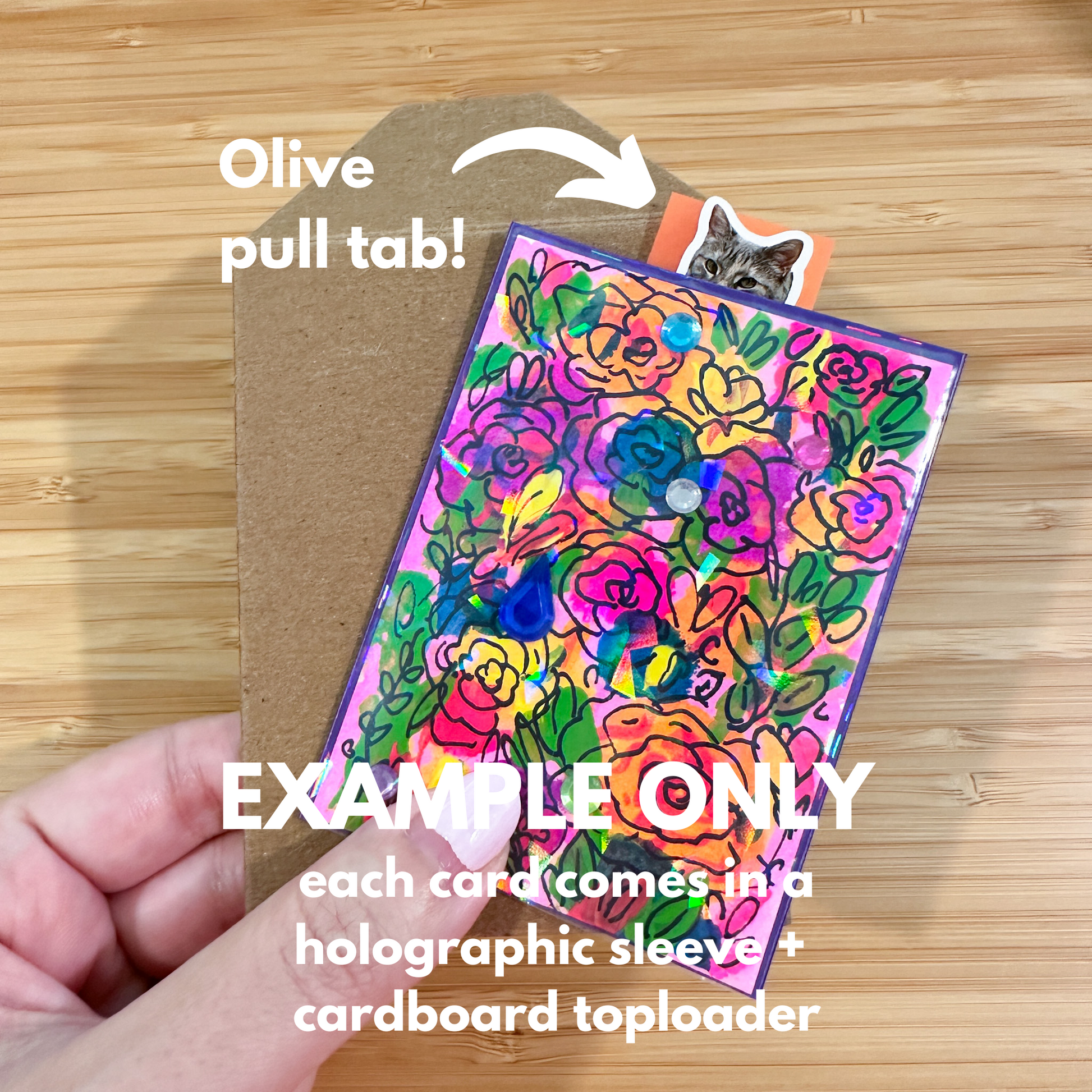 Every card will include 1 holographic PVC-free removable plastic sleeve + cardboard toploader (aka 'shipping shield') to ensure safety during shipment. As a fun bonus, each card will also include an Olive (my cat) pull-tab to help easily remove the card from the toploader! (See photos for example)