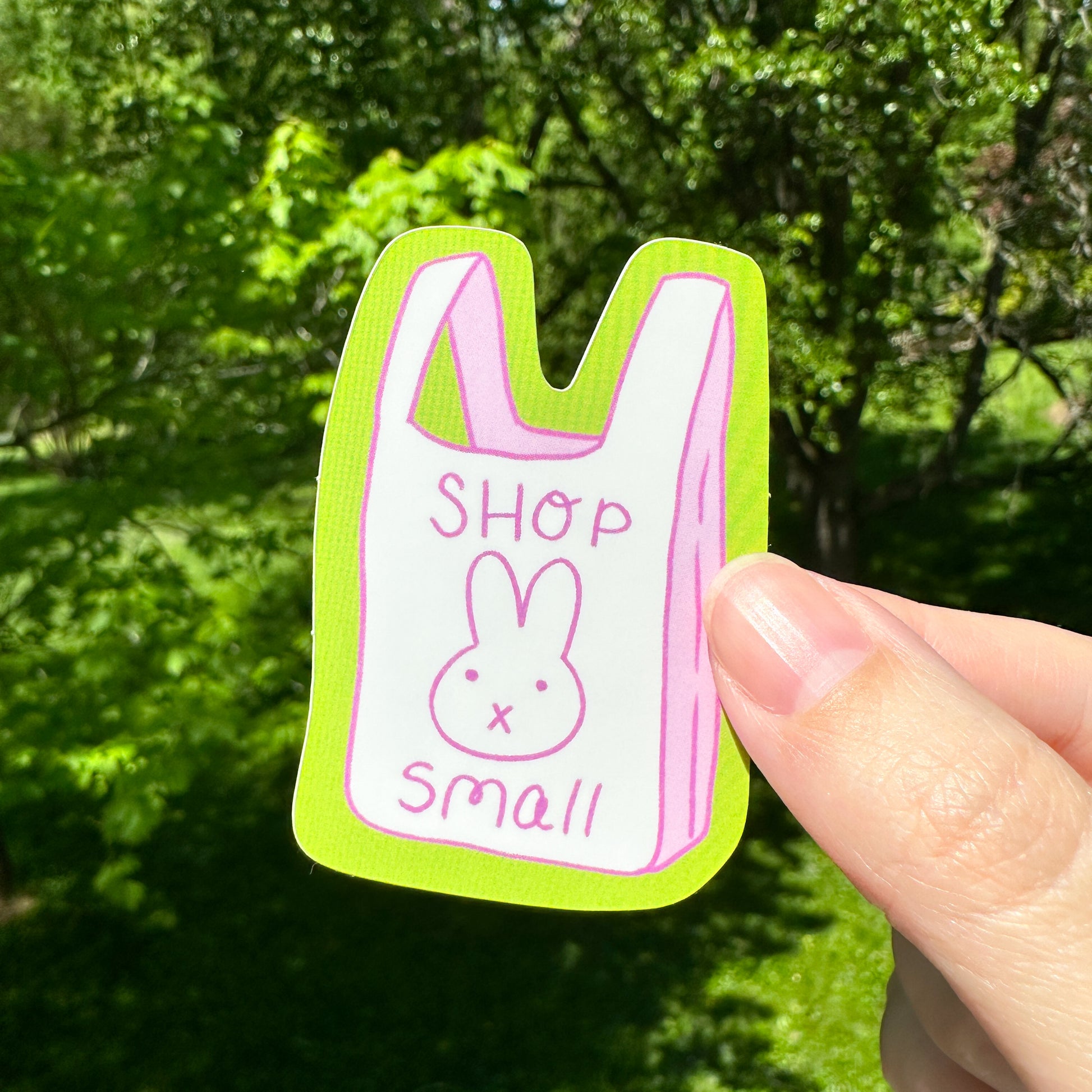 A die-cut sticker featuring a cute bunny on a shopping bag to remind us to shop small :) This sticker has a smooth, matte, weatherproof finish.