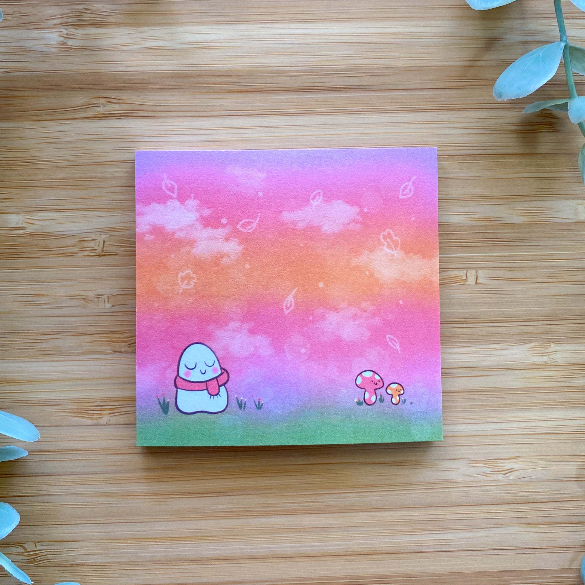 Brighten up your workday with this colorful sticky note pad! Featuring a cozy scene of a small ghost and mushrooms, it's sure to add some fun to your desk. Writing yourself reminders has never been so enjoyable!