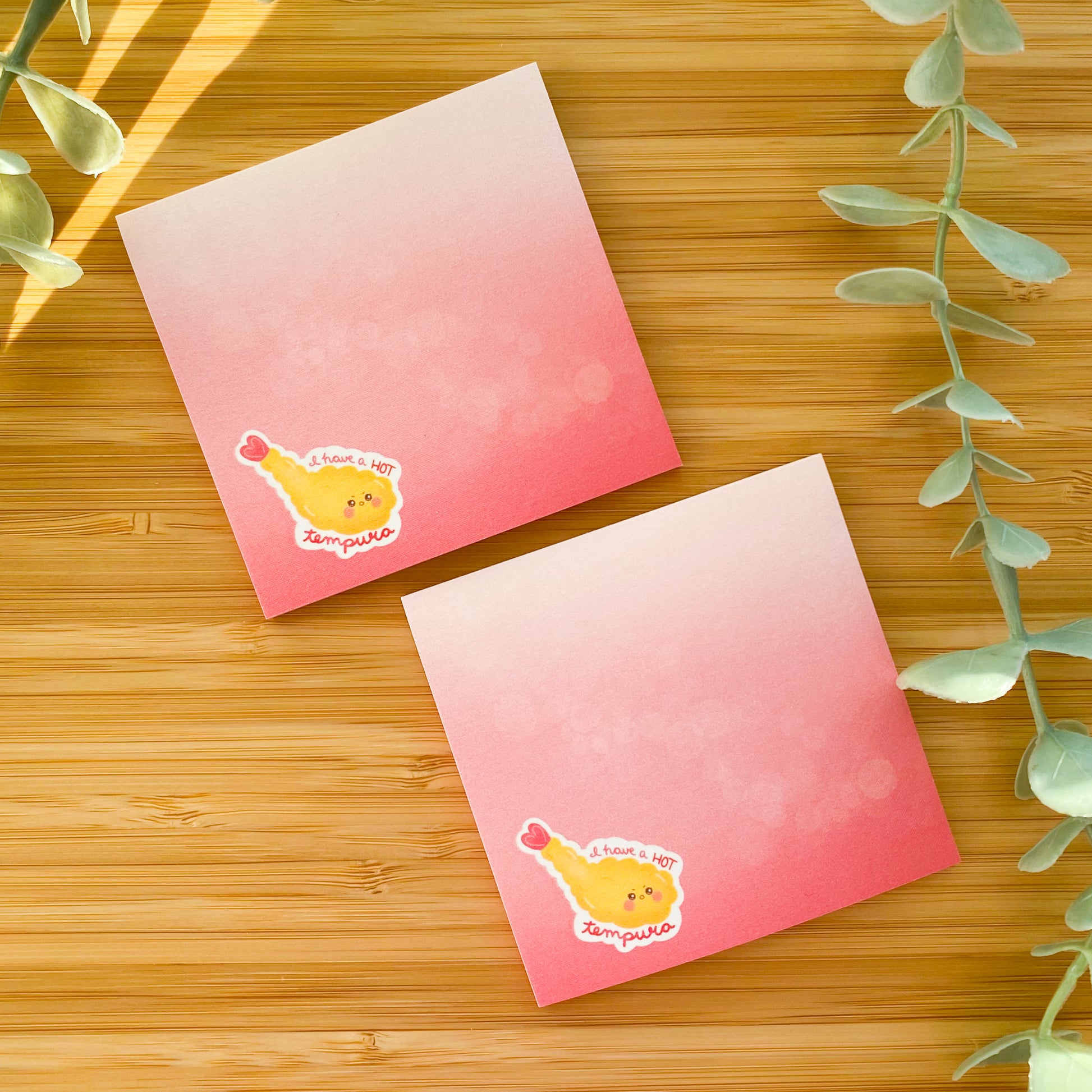 Make your memos pop with this tempura-themed sticky note pad! Featuring moody shrimp and pinky hues, this fishy companion makes note-taking as tasty as tempura!