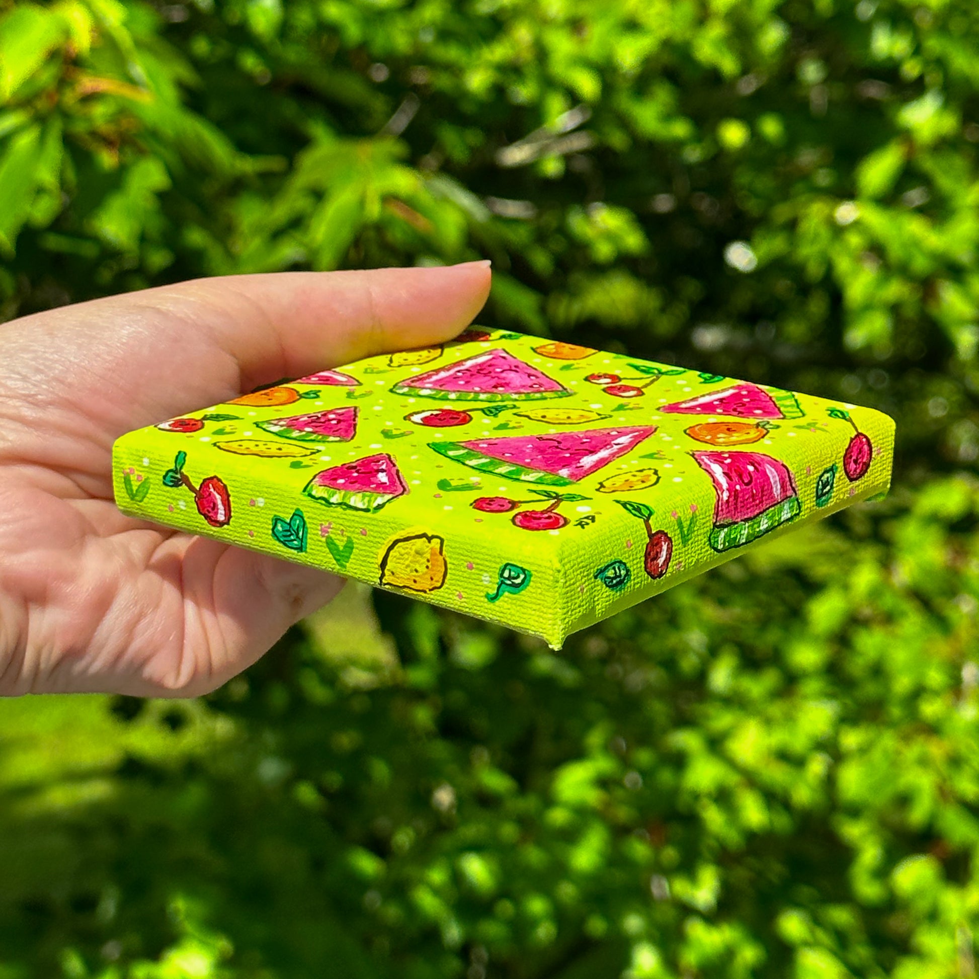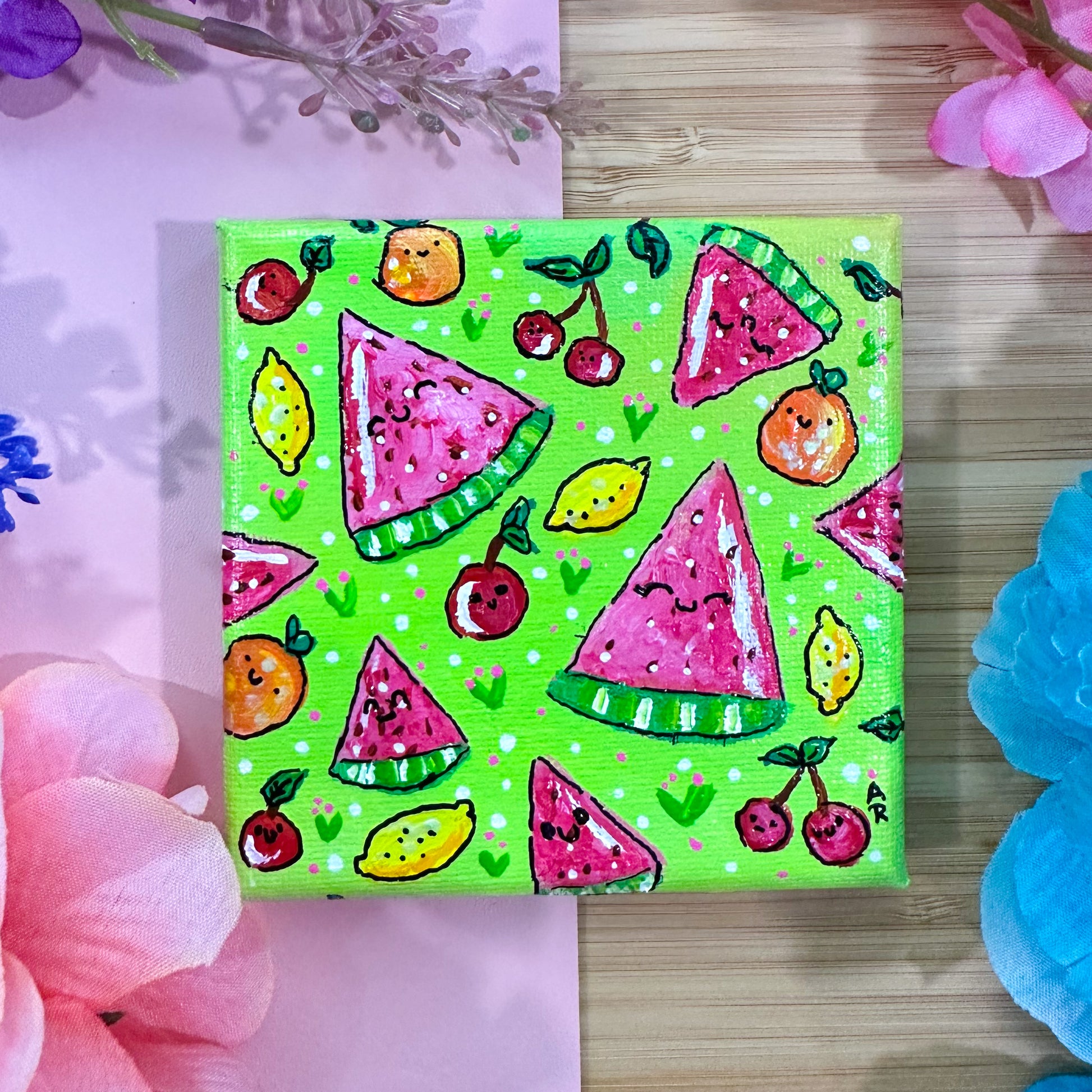 summery fruit friends, acrylic paint on 4" x 4" x 0.5" canvas. coated and sealed with clear, glossy acrylic finish.