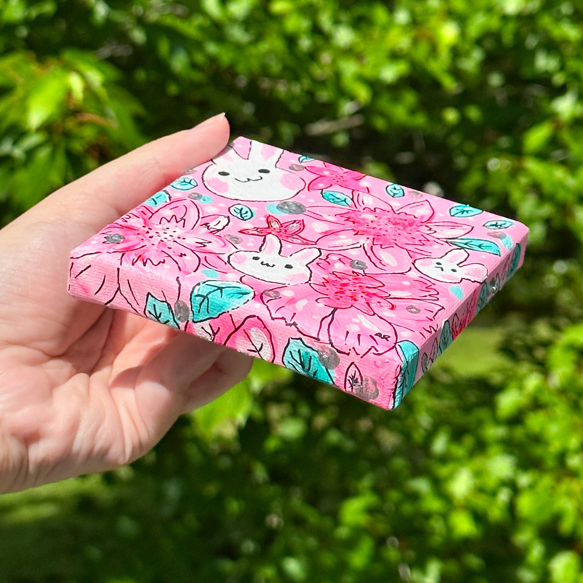 bright and cheerful bunnies among the flowers. acrylic paint on 4" x 4" x 0.5" canvas. coated and sealed with clear, glossy acrylic finish.
