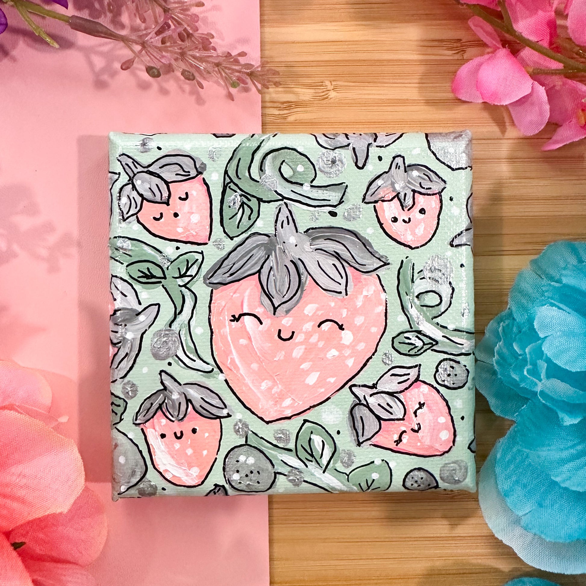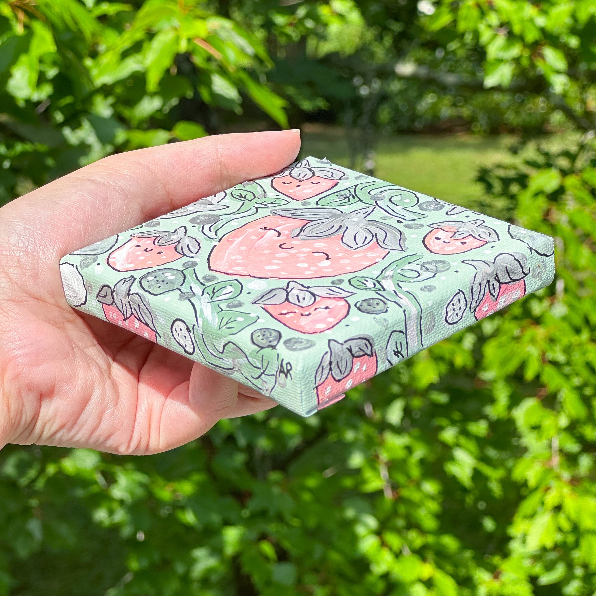happy little strawberries at the market, acrylic paint on 4" x 4" x 0.5" canvas. coated and sealed with clear, glossy acrylic finish.